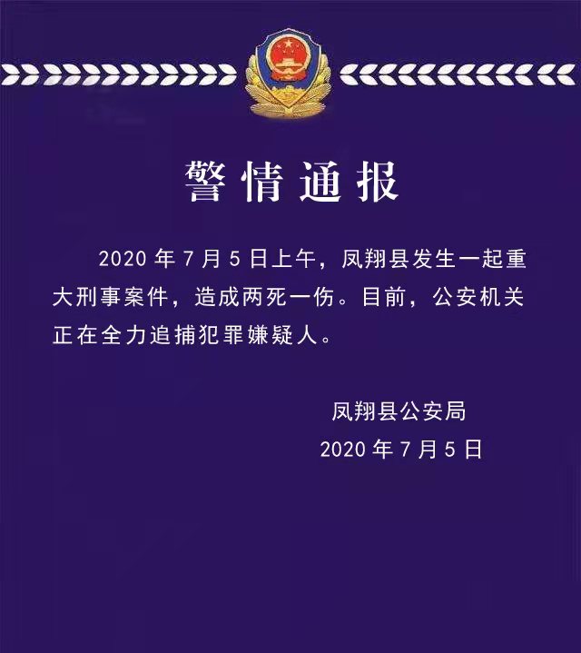 央视新闻7月5日消息,今天上午(7月5日),陕西凤翔发生一起重大刑事案件,造成两死一伤,目前警方正在全力缉捕犯罪嫌疑人。