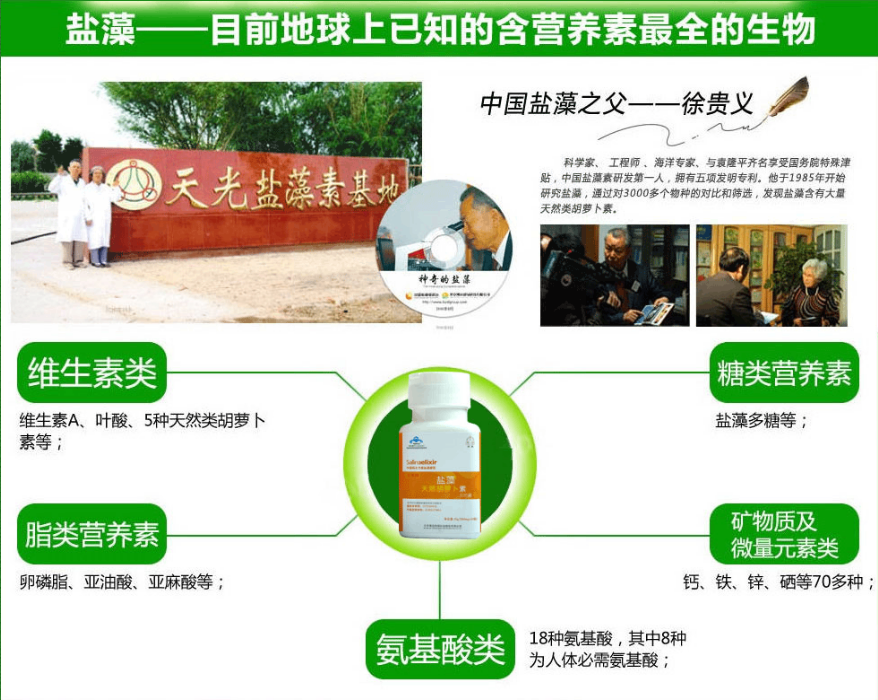 有"中国盐藻素之父"之称的徐贵义教授,经过几十年的潜心研究,终于从单细胞微生物盐藻素中成功提取出了最新一代盐藻素软胶囊。临床试验证明:单细胞微生物盐藻的提取物--盐藻素软胶囊中的元素含量比例与人体的体液、细胞浆液相符合,因此很容易突破细胞壁、深入细胞内部,对细胞举行全面、均衡的营养,办理细胞种种题目,非常有利于资助调治人体内的矿物质从失衡状态到均衡状态,从而有用修复人体内受损的细胞,到达增补人体营养、提高人体免疫力。天光盐藻素胶囊是用现代科技手段从盐藻中提取、浓缩、精制而成。天光盐藻素的电视广告是不是真的?天光盐藻素的正品电话?天光盐藻素价格是多少钱?天光盐藻中秋国庆有什么优惠活动?