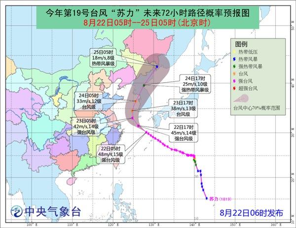 今年第19号台风“苏力”(强台风级)的中心今天(22日,下同)早晨5点钟位东海东北部海面,就是北纬30.1度、东经128.2度,中心附近最大风力有15级(48米/秒),中心最低气压为945百帕,七级风圈半径300-450公里,十级风圈半径100-150公里,十二级风圈半径70公里。