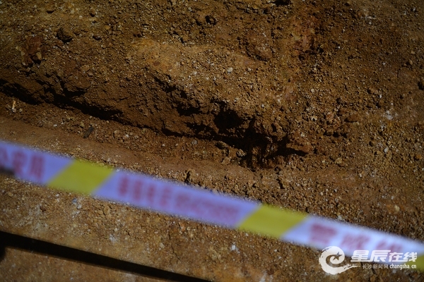 (目前,新发现的古墓遗址现场已经围起了警戒线。墓坑中央,还残留着工作人员用锄头勘探出来的古墓形状。)