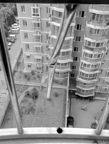 9栋一共18层楼,记者从一楼往上仰望,果然可以看到,13楼一户人家防盗护窗有一处破开,一根钢管已经脱离外露。