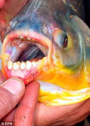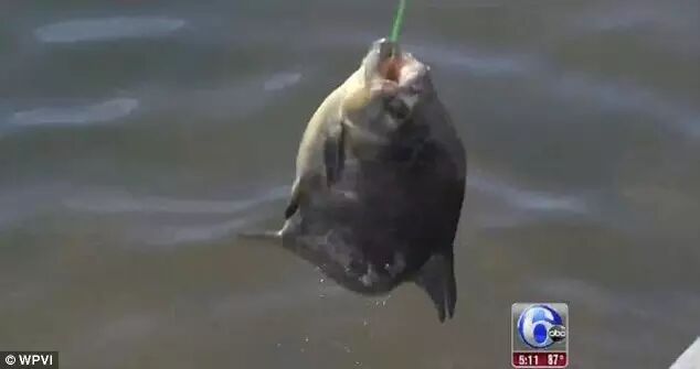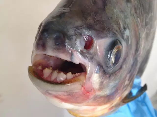 一条挺大的鱼,不错。准备解开的时候,发现卧槽这鱼有那么大颗牙齿,跟人类一样!他就知道自己钓到了条食人鱼。