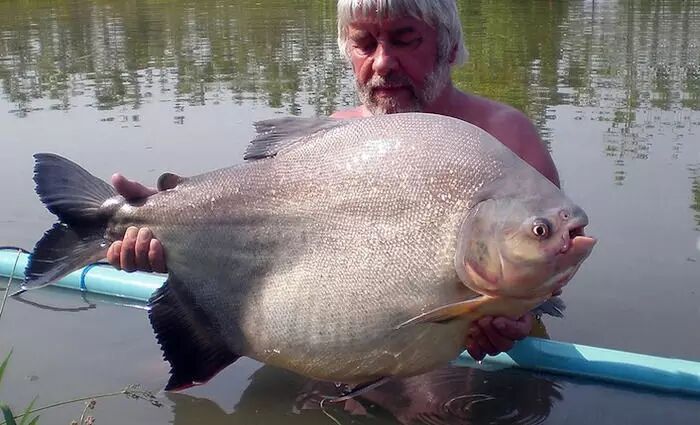 这条鱼叫Pacu fish,中文名字“切蛋鱼”,学名锯腹脂鲤。属于食人鱼的一种。